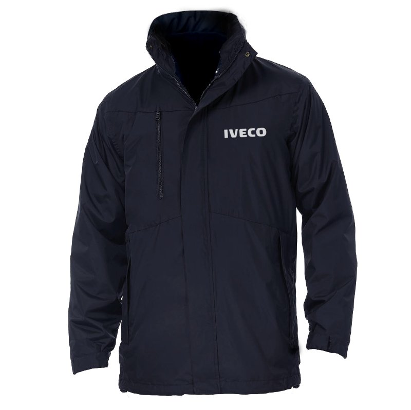 Warstwa zewnętrzna została wykonana z poliestru wysokiej jakości o parametrach wodoszczelności na poziomie 5000mm. Ochronę przed trudnymi warunkami pogodowymi potęgują wzmocnione szwy oraz właściwości wiatroszczelne materiału. Kurtka charakteryzuje się wysoką funkcjonalnością: posiada kaptur z możliwością schowania w kołnierzu, dół regulowany ściągaczami dla lepszego dopasowania oraz system trzech zasuwanych kieszeni (dwie boczne i jedna na piersi) na niezbędne przedmioty. Logotypy IVECO umieszczone na piersi oraz na plecach warstwy zewnętrznej podkreślają profesjonalną przynależność do marki i budują spójną identyfikację wizualną załogi.