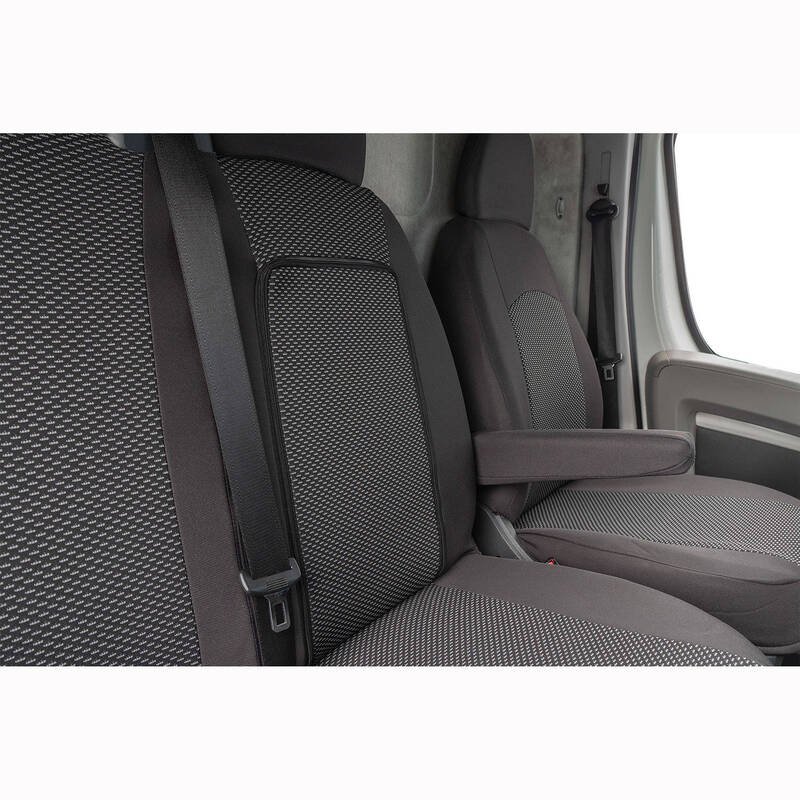 Dedykowane pokrowce w konfiguracji 1+2 zostały zaprojektowane z myślą o najnowszej odsłonie modelu IVECO Daily, produkowanej od 2022 roku. Zestaw obejmuje pokrowiec na fotel kierowcy oraz na dwuosobową kanapę pasażerów, uwzględniając aktualną geometrię siedzeń oraz rozmieszczenie elementów sterujących. Produkt wykonano z wysokogatunkowych tkanin technicznych o wzmocnionej strukturze, które charakteryzują się wysoką odpornością na ścieranie oraz zabrudzenia wynikające z codziennej, intensywnej eksploatacji w transporcie i logistyce.